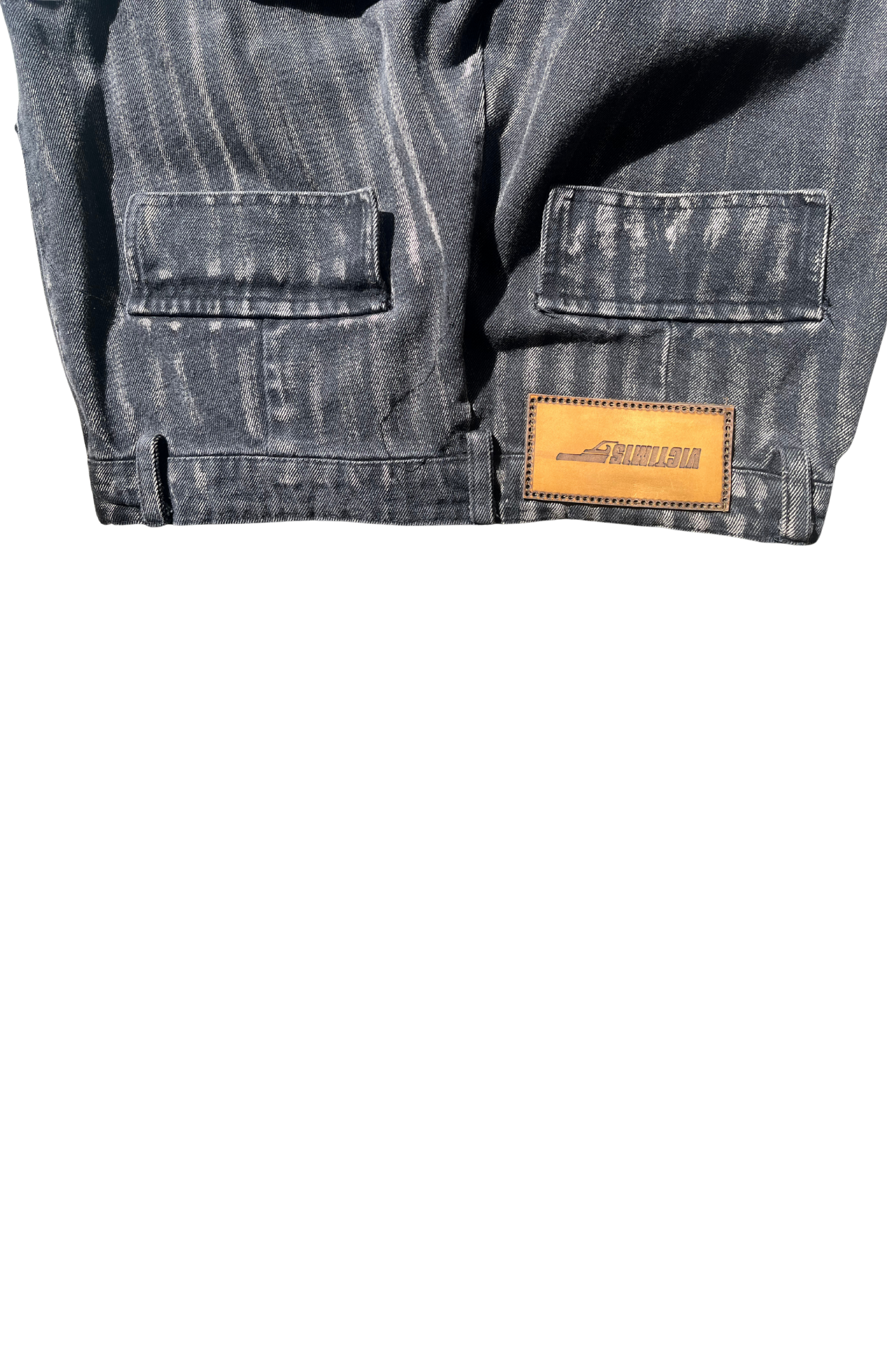 At the hem, a signature leather logo add-on elevates the design, creating a luxurious contrast against the denim’s raw texture.