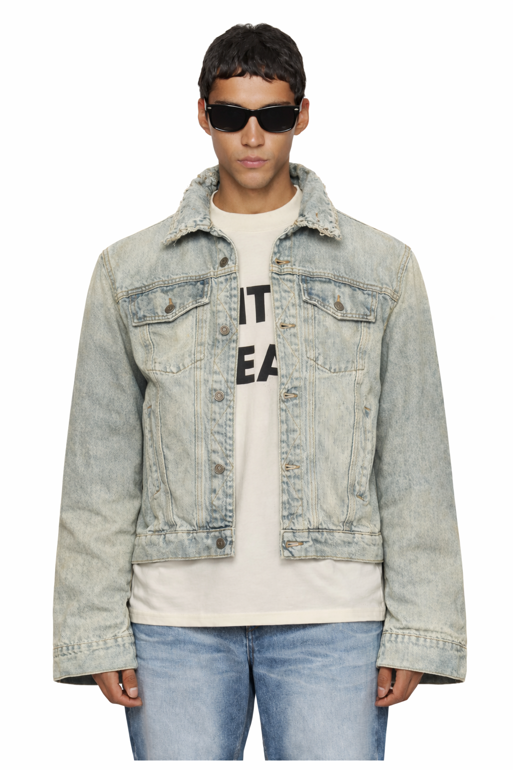 Silhouette: Traditional trucker jacket cut with a structured, straight fit that sits at the waist, offering a versatile shape that works layered or standalone.