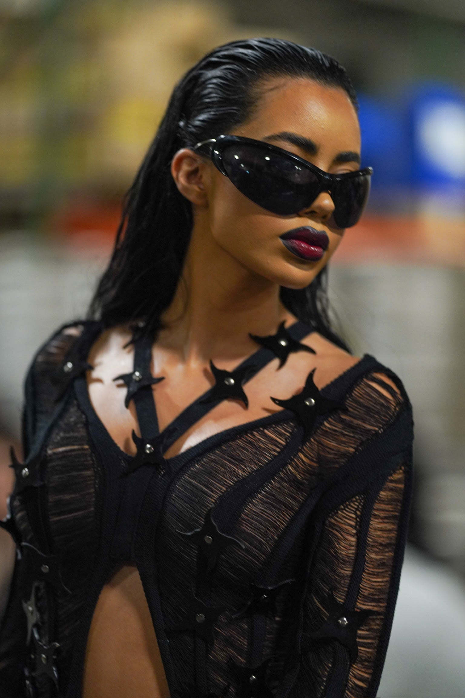 The plexiglass shuriken stars add an aggressive yet elegant touch, catching light and commanding attention with every movement. The open, asymmetrical design and sculpted fit push boundaries, blending rebellion with high fashion. This piece isn’t just a top—it’s armor for the bold, made for those who dare to disrupt the norm.
