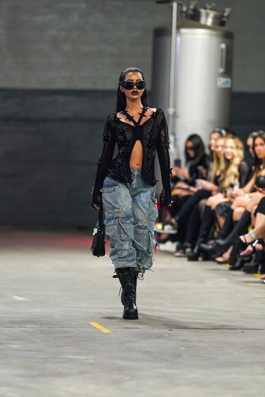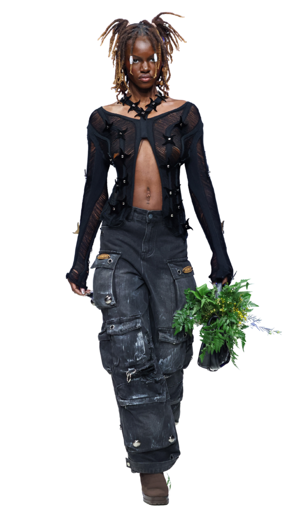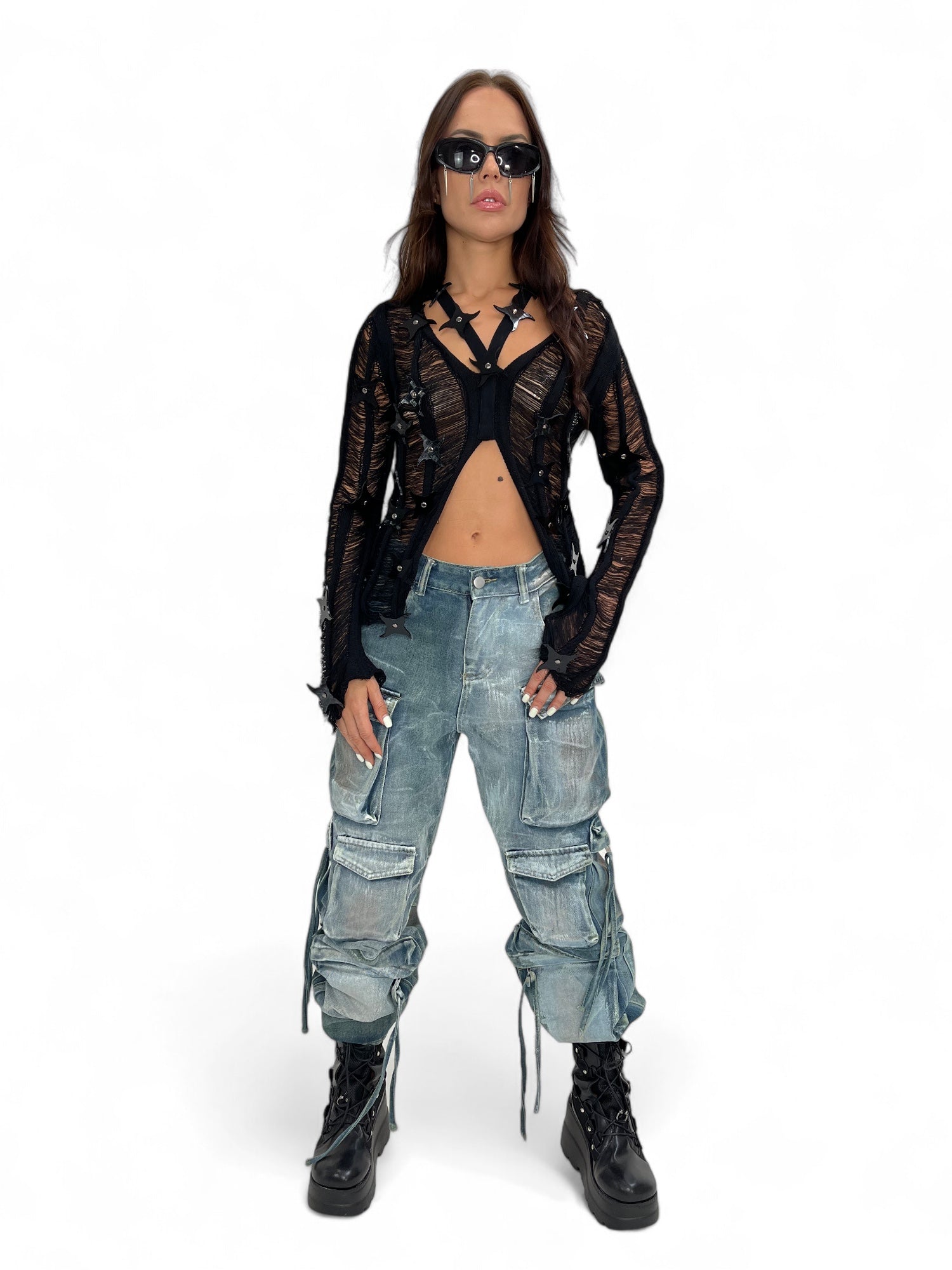 The Threaded Fabric Top with Plexiglass Shuriken Stars is a fusion of futurism and raw edge, redefining what avant-garde streetwear looks like. Crafted from a delicate yet structured mesh, the top features intricate threadwork that creates a deconstructed, almost cyberpunk aesthetic.