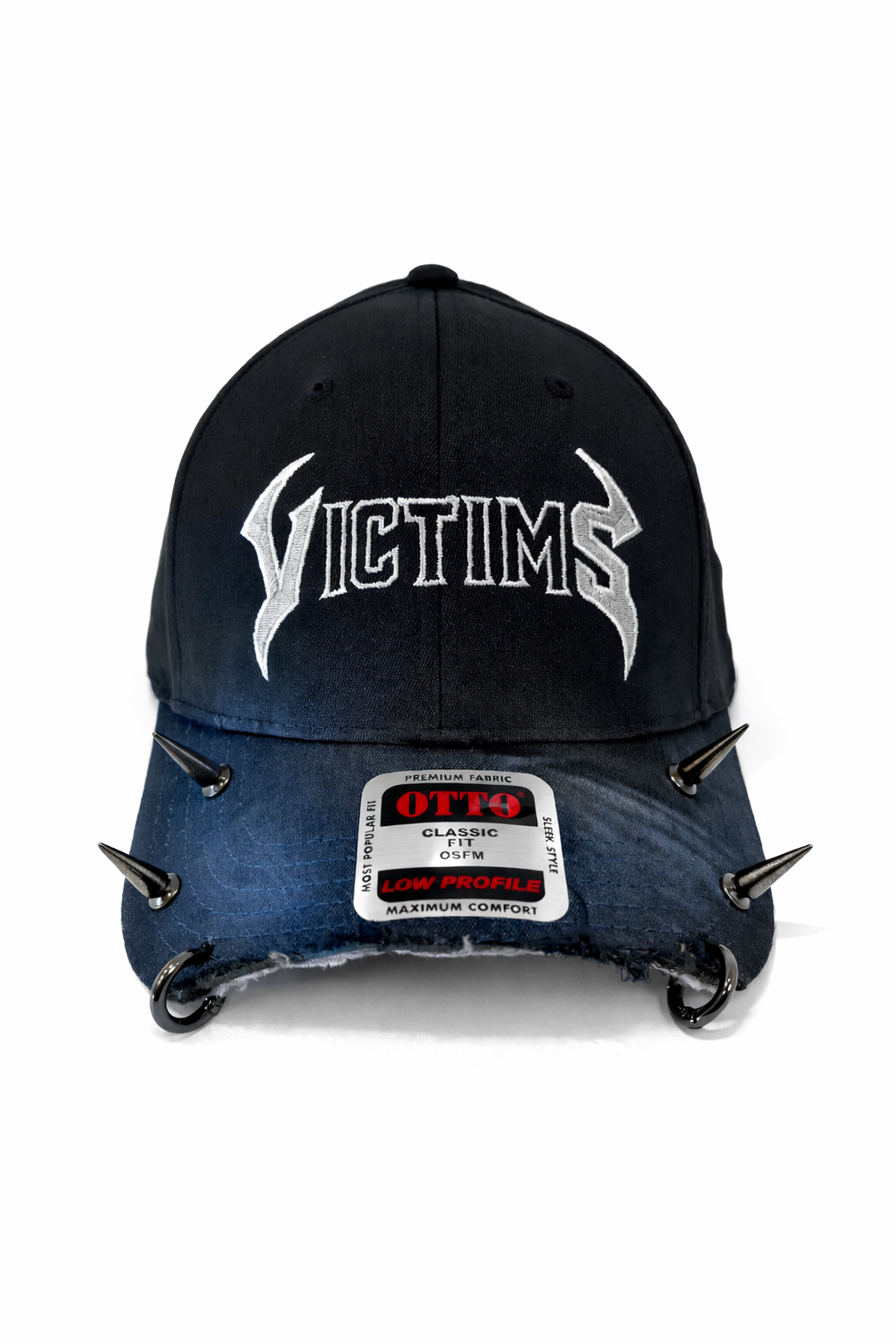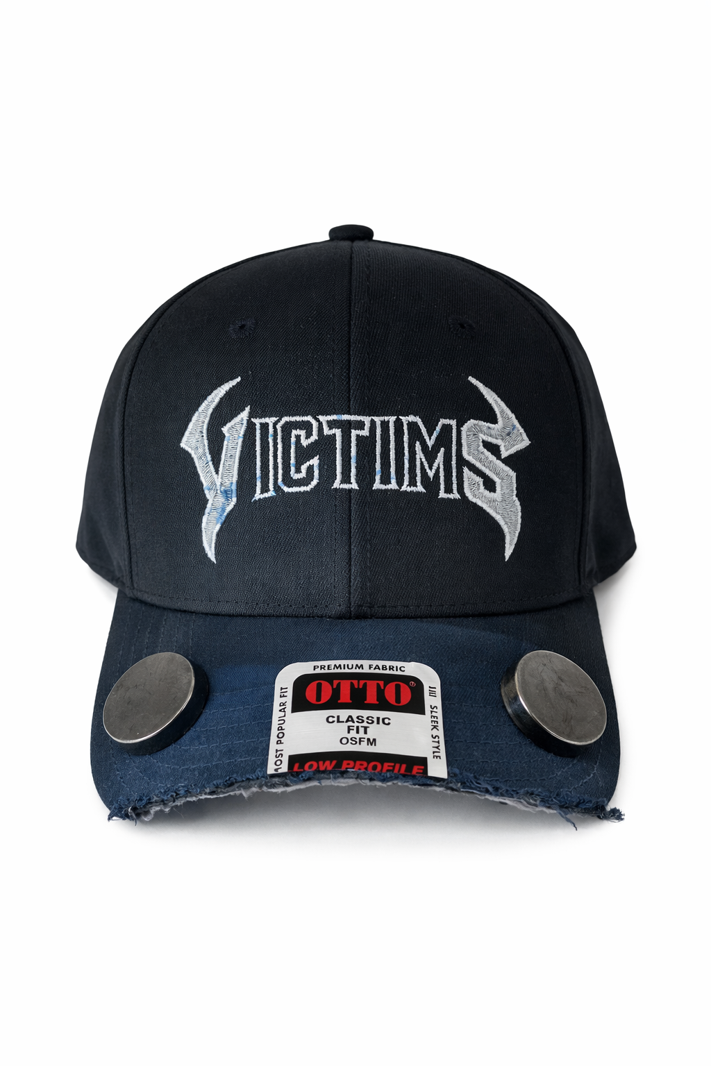 Front embroidery: The word “VICTIMS” stitched in bold white thread, using a sharp, metal-inspired typeface with horned/winged extensions on both sides of the lettering.